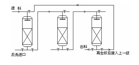 應用方案為:首先從pH值來看,pH值:3~9,說明該鎢酸鈉溶液已經經過Na2S并調pH沉鉬MOS3,加入90~95%左右鉬硫代化反應MO42-﹢4S2-﹢4H2O=MS42-﹢8OH- 所需理論量的硫化鈉,再將溶液的pH值調至8.0左右進行硫代化2小時,然后將溶液的PH值調至2.0~3.0左右,煮沸后,將溶液稀釋一倍,冷卻后過濾的結果;· 從鎢酸鈉含量:30~60g/l;鉬酸鈉含量:0~2g/l;釩酸鈉含量:0.5~0.7g/l,以及后面鈉離子和相關陰離子等都表明溶液也已沉鉬;· 針對客戶要求:提取釩、同時提取鎢與鉬、或鎢與鉬分離。二、鎢鉬分離原理及分離方法1、基本原理 鎢和鉬對硫的親合力存在一定差異,在一定條件下可使鉬酸根離子優先較完全硫代化成為硫代鉬酸根離子,反應如下(M代表W和MO): MO42-﹢S2-﹢H2O=MO3S2-﹢2OH- (1)MO42-﹢2S2-﹢2H2O=MO2S22-﹢4OH- (2)MO42-﹢3S2-﹢3H2O=MOS32-﹢6OH- (3)MO42-﹢4S2-﹢4H2O=MS42-﹢8OH- (4) 中南大學盧江波等[4]對鎢鉬的硫代化反應的熱力學機理進行了研究,推算出了在25℃時,反應(1)至(4)的平衡常數,從鎢、鉬的硫代化反應平衡常數可以看出,鉬的各級硫代化反應的平衡常數比鎢同級硫代化反應的平衡常數高出兩個數量級左右,故鉬能夠優先硫代化。在隨后的調酸過程中硫代鉬酸鹽轉變成MoS3沉淀,而大部分的鎢則保留在溶液中,從而實現兩者分離。 2、鎢、鉬、釩的性質與分離方法鎢鉬分離是鎢鉬提取冶金中一道重要的工序,目前工業上應用的方法主要有:三硫化鉬沉淀法、選擇性沉淀法、離子交換法、萃取法等。這幾種方法多用于從鎢酸鹽溶液中除去少量的鉬(MO<1g/l, WO3/ MO>100)。而在鎢(鉬)廢料回收處理中經常會碰到WO3/MO比較接近的原料需進行鎢鉬分離,如廢催化劑、各種鎢鉬廢渣等。因此,從高鉬鎢溶液中(或高鎢鉬溶液)實現鎢鉬分離方法為加入90~95%左右鉬硫代化反應MO42-﹢4S2-﹢4H2O=MS42-﹢8OH- 所需理論量的硫化鈉,再將溶液的pH值調至8.0左右進行硫代化2小時,然后將溶液的PH值調至2.0~3.0左右,煮沸后,將溶液稀釋一倍,冷卻后過濾,由于鉬的硫代反應比鎢的硫代反應優先,大部分的鎢則保留在溶液中,從而實現兩者的分離,實現鉬鎢分離后得到的調酸液Mo/WO3降至0.03左右;得到的硫化鉬渣WO3/Mo降至0.04左右。鎢在水溶液中的化學性質較復雜,除生成正鎢酸根離子之外,還生成穩定的同多鹽和雜多酸鹽。關于正鎢酸根離子形成 仲鎢酸根陰離子或偏仲酸根陰離子的聚合形式,不同的研究者提出了不同的表達式,主要有以下幾種:1)、凱泊特等提出的表達式為: 2)、戈登等提出的表達式為: 鉬在水溶液中的化學狀態可由下式表示: 在較高酸度(pH<2.0)條件下,鉬呈陽離子形式存在,而鎢主要以陰離子形式存在,而且容易生成鎢酸沉淀,在酸度較低時,又容易生成鎢、鉬雜多酸,從而使二者的分離變得困難。鉬和釩的性質較為相似,因此在溶液中它們的存在形態及行為也比較相似,在pH值大于或等于6.5時,鉬在溶液中只以鉬酸根陰離子存在;在pH值為6.5~2.5的區間內,發生聚合反應,生成各種多鉬酸根陰離子;在溶液的pH值小于2.5時,生成MoO2+2或更為復雜的陽離子;在pH 值低于1時,陽離子是主要的存在形式。釩在溶液中的聚合狀態不僅與溶液的酸度有關,而且也與其濃度關系密切。當釩濃度很低時,在所有的pH值下釩均以單核形式存在。當釩濃度高時,產生聚合反應,生成高聚合度的同多酸離子,其聚合狀態與溶液的pH值相關。當釩濃度一定時,在pH 值大于1O時,釩主要以VO43-一形存在;在pH值為9.6~10.0之間時,釩主要以V2O74-一形態存在;在pH值為7.0~7.5之間時,釩主要以VO3-形態或者偏釩酸銨分子形態存在,尤其是當溶液中有銨鹽存在時,因共同離子效應,偏釩酸銨分子是主要的存在形態。當pH 值小于4時,在一定條件下,釩可以依次形成各種陽離子:VO2+、V3+、V(OH)2+和V2+,當含釩溶液的pH值小于1時,釩主要以VO2+形態存在。從上述可知,在一定pH值條件下,利用螯合樹脂吸附偏釩酸銨分子和釩氧陽離子而不吸附鉬酸根陰離子的特性可以實現鉬釩分離。三、樹脂選擇目前爭光開發此類樹脂情況如下:將溶液pH調到2~3: 1、先采用爭光1#樹脂,該種樹脂對釩的吸附是分子吸附或陽離子吸附。而鎢、鉬都是以雜多酸的陰離子形式存在,不會被該樹脂吸附;采用2BV2mol/L的NaOH作解析劑對負載釩的樹脂進行解析。2、再采用爭光2#樹脂來吸附,這時可以將鎢、鉬同時吸附到樹脂上。在pH=2.5~4時,鎢鉬形成聚鎢酸根離子和聚鉬酸根離子,用轉成硫酸根或氯根型態的2#樹脂能吸附97%以上的鎢鉬,用10%氨水作解吸劑,解吸效果很好。清洗好后可進行下次吸附,重復使用性能穩定。吸附容量為130~150g/L-R。3、經過2#吸附并洗脫得到的鎢酸銨和鉬酸銨溶液,這時,可以采用爭光3#樹脂在堿性條件下選擇性吸附鎢酸銨溶液中微量的鉬酸根,飽和后采用10%氫氧化鈉作解吸劑,解吸效果很好。清洗好后可進行下次吸附,重復使用性能穩定。 四、工藝選擇運行工藝:可選用多柱串聯交替連續運行和再生。