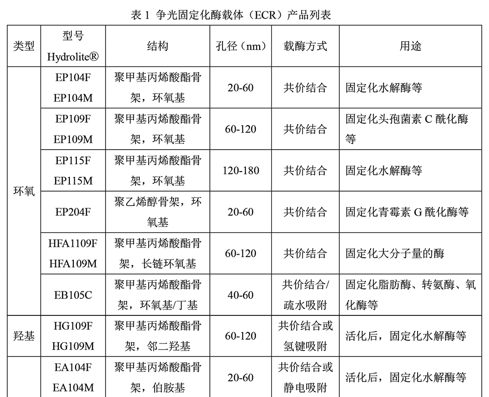 爭光現已自主研發出具有多種骨架、孔結構和結合基團類型較為齊全的系列固定化酶載體,共有環氧、羥基、氨基、疏水、吸附和親和共六大類、二十余個品種。固定化酶載體產品具有粒度均勻、結構可控、載酶活力高、批次穩定性好、機械強度優等特點,可固載多種生物酶,以滿足不同行業領域、不同使用環境下的生產應用和科學研究等的固定化需求。